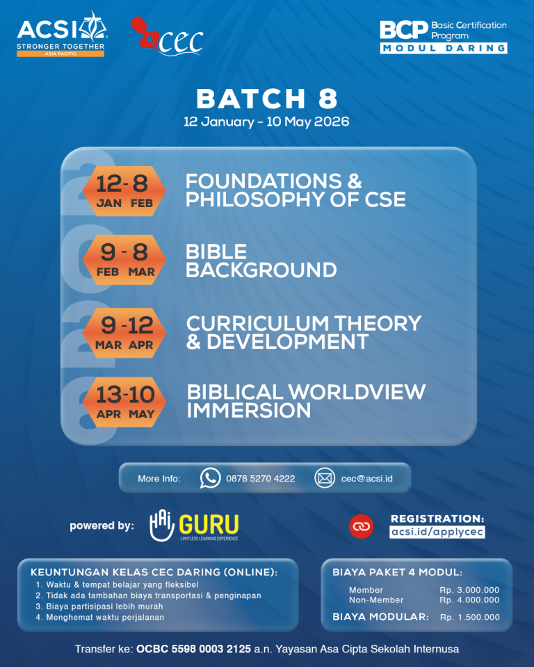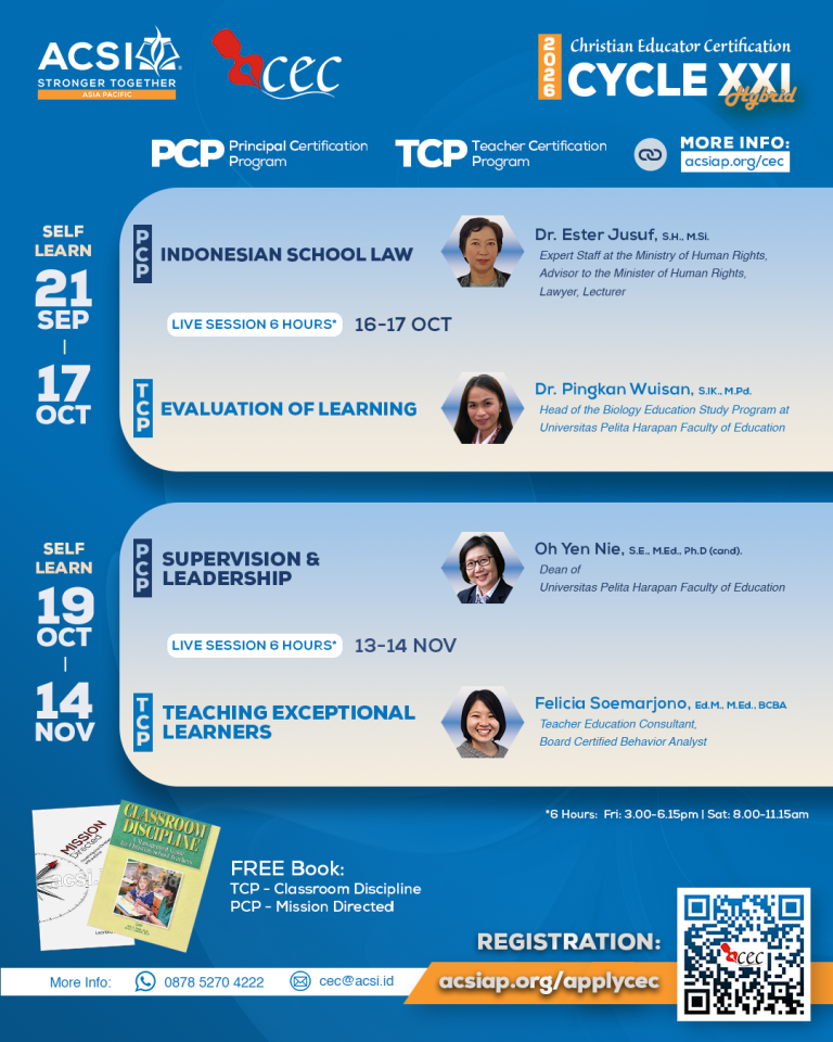Christian Educator Certification combines basic modules of Education and Christianity with three paths Basic Certification Program (BCP), Teacher Certification Program (TCP) and Principal Certification Program (PCP), each consisting of 4 modules. The purpose is to equip individuals as Christian Educators with knowledge, skills and attitude needed to develop an effective Christian Education in Indonesia.