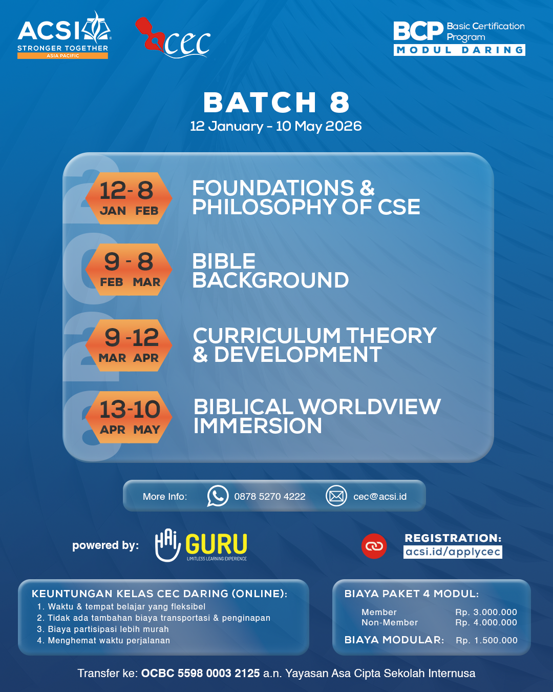 Basic Certification Program (BCP) terdiri dari modul-modul yang kami yakini perlu dipelajari oleh siapa pun yang melayani di dunia pendidikan, khususnya dunia pendidikan Kristen.