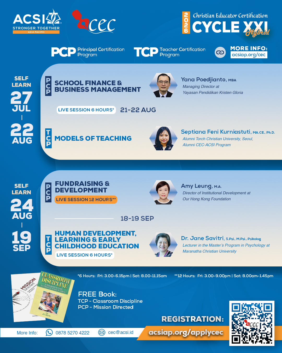 Principal Certification Program (PCP) terdiri dari modul-modul yang kami percaya dapat berguna dan membantu para kepala sekolah, pimpinan sekolah, dan bahkan anggota yayasan sekolah untuk lebih lebih diperlengkapi dalam memimpin sekolah dan menjadikannya terus bertumbuh dan berkembang.
